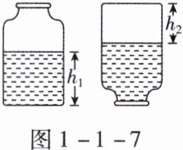 4. 如图 1 - 1 - 7 所示,一个饮料瓶装有多半瓶水,用刻度尺测出水的深度为 $ h_1 $,然后将该瓶倒置,水面到瓶底的高度为 $ h_2 $,若再用三角尺和刻度尺配合,测量瓶底的直径为 $ D $,那么,该瓶的容积大约为(
