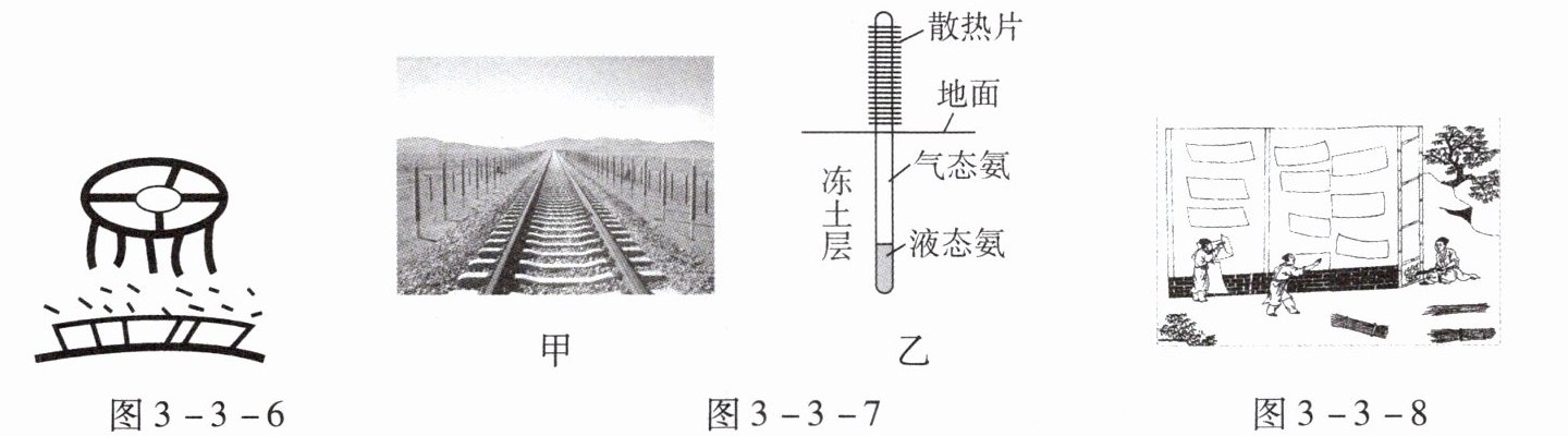 2. 我国的青藏铁路是世界上海拔最高的铁路,在冻土区铁路两侧安装有许多热棒,如图3-3-7甲所示。热棒是封闭的中空长棒,下端插在冻土中,里面填充低沸点的液态氨,如图3-3-7乙所示,液态氨从冻土中吸热