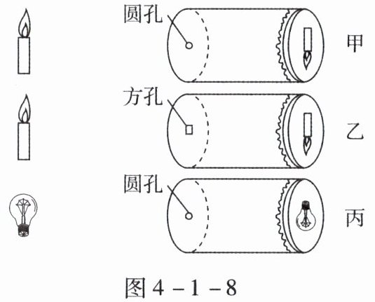 7.学习了光学知识后,爱动脑筋的小桐和小朵想自己探究小孔成像现象,如图4 - 1 - 8所示,她们给两个空罐的底部中央分别打上一个圆孔和一个方孔,再用两片半透明的塑料膜蒙在空罐的口上。分别将小孔对着烛焰和灯泡,可以看到烛焰和灯泡通过小孔所成的像。