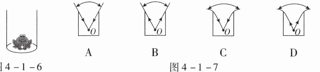 5.如图4 - 1 - 6所示,枯井中的青蛙位于井底“坐井观天”,假设空气分布均匀,$O$点为青蛙眼睛的位置,图4 - 1 - 7中能正确描述青蛙通过井口的观察范围的是(