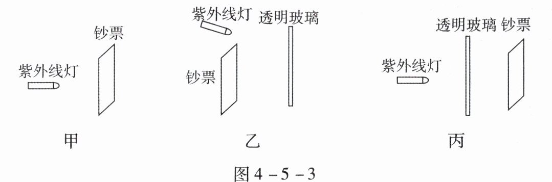 。(3)如图4-5-3丙所示,他把这块透明玻璃放在紫外线灯和钞票之间,让紫外线灯正对玻璃照射,在另一侧无论怎样移动钞票,“100”字样都不发光。他做这次实验是为了探究