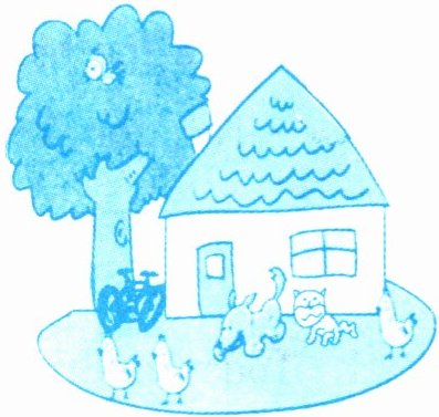 This is my house. There is a tree beside it. There is a bike. There are some animals like a dog, a cat and some chickens. I love my home.