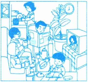 The girl is watching TV. The man is reading a newspaper. The woman is cleaning.