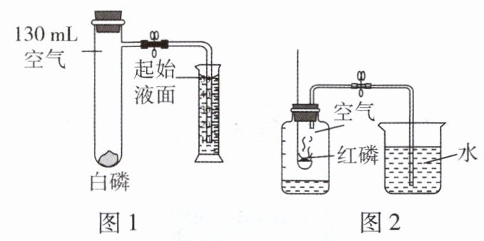 6. 仿照拉瓦锡实验的原理,我们也可粗略测定空气中氧气的含量。白磷和红磷燃烧均生成五氧化二磷,白磷在含有空气的密闭容器中能自发燃烧如图1所示,红磷点燃后伸入盛有空气的集气瓶中如图2所示。两实验均可验证空气中氧气的体积分数,下列叙述错误的是( )。