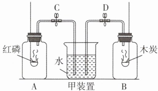 2. 某同学设计了如图甲装置所示的实验,红磷和木炭均为足量,分别把A、B两瓶中的红磷和木炭点燃,将燃烧完毕冷却至室温后,打开C、D两处的夹子,她将看到甲装置的烧杯中的水进入____瓶(填“A或B”)。