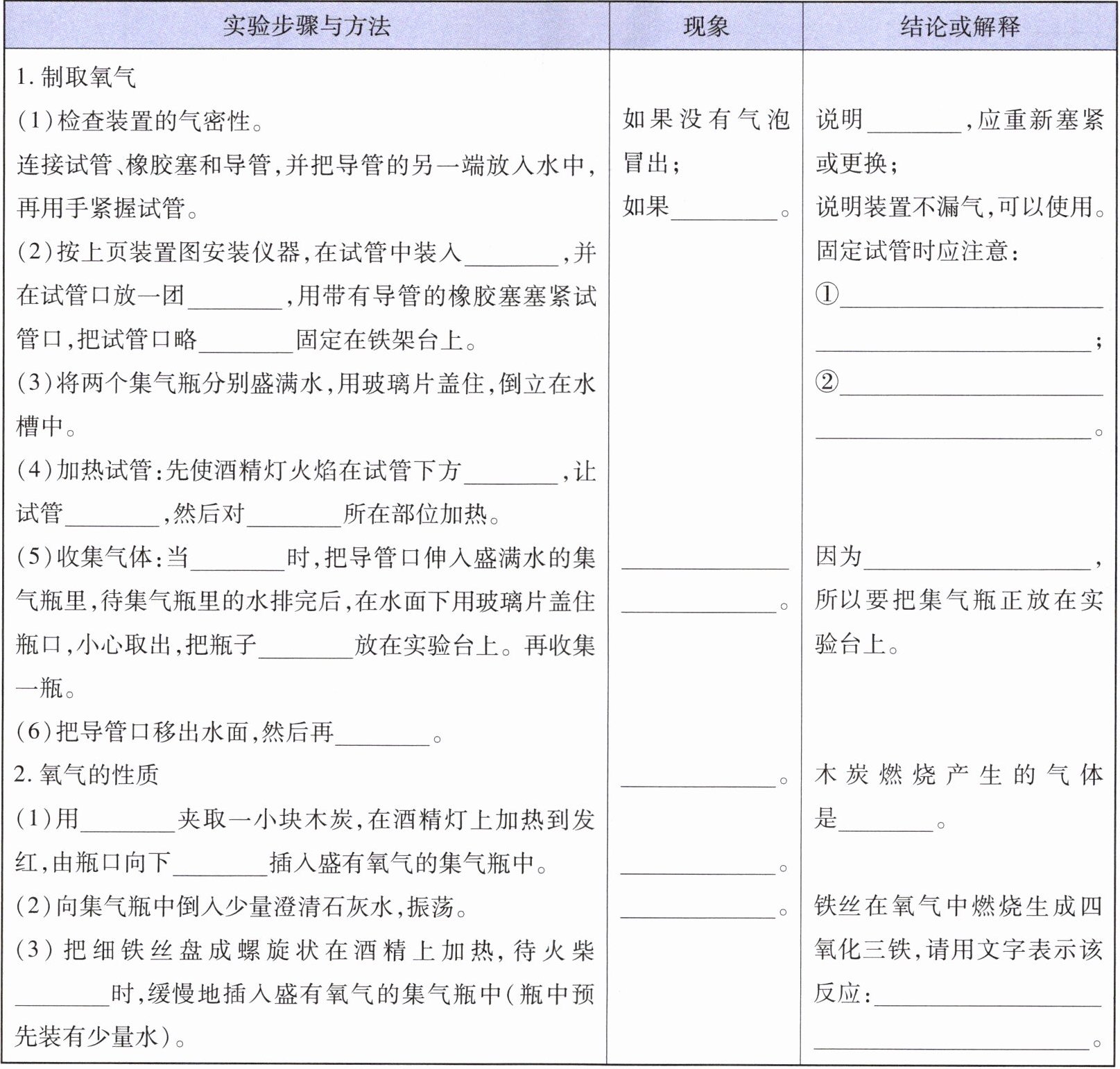 |1. 制取氧气(1) 检查装置的气密性。连接试管、橡胶塞和导管,并把导管的另一端放入水中,再用手紧握试管。(2) 按上页装置图安装仪器,在试管中装入______,并在试管口放一团______,用带有导管的橡胶塞塞紧试管口,把试管口略______固定在铁架台上。(3) 将两个集气瓶分别盛满水,用玻璃片盖住,倒立在水槽中。(4) 加热试管:先使酒精灯火焰在试管下方______,让试管______,然后对______所在部位加热。(5) 收集气体:当______时,把导管口伸入盛满水的集气瓶里,待集气瓶里的水排完后,在水面下用玻璃片盖住瓶口,小心取出,把瓶子______放在实验台上。再收集一瓶。(6) 把导管口移出水面,然后再______。2. 氧气的性质(1) 用______夹取一小块木炭,在酒精灯上加热到发红,由瓶口向下______插入盛有氧气的集气瓶中。(2) 向集气瓶中倒入少量澄清石灰水,振荡。(3) 把细铁丝盘成螺旋状在酒精上加热,待火柴______时,缓慢地插入盛有氧气的集气瓶中(瓶中预先装有少量水)。|如果没有气泡冒出;如果______。____________________________________________________________________________________|说明______,应重新塞紧或更换;说明装置不漏气,可以使用。固定试管时应注意:①______;②______。因为______,所以要把集气瓶正放在实验台上。木炭燃烧产生的气体是______。铁丝在氧气中燃烧生成四氧化三铁,请用文字表示该反应:______。|