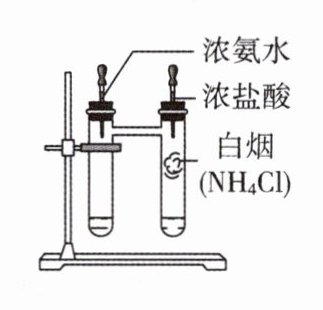 2. 如图所示,分别同时在双连试管中滴入 2~3 滴浓氨水和浓盐酸,2~3 s 后即观察到滴入浓盐酸的试管中产生白烟。下列叙述错误的是( )。
