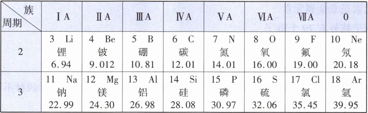 |3|11 Na钠22.99|12 Mg镁24.30|13 Al铝26.98|14 Si硅28.08|15 P磷30.97|16 S硫32.06|17 Cl氯35.45|18 Ar氩39.95|