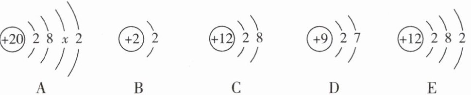 (2)①根据在原子中,质子数=核电荷数=核外电子数,可得20=2+8+x+2,则x=8;②元素的种类由质子数决定,因为C、E的质子数相同,所以C、E属于同种元素的粒子,故B、C、D、E中含有3种元素的微观粒子。