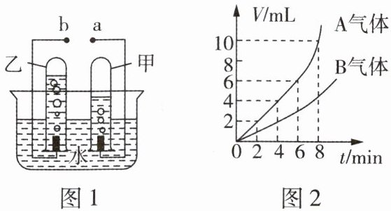 4. 如图所示,图 1 是电解水的装置,图 2 是甲、乙试管中收集到的气体体积与时间的关系图。若甲试管中生成气体 A,下列说法错误的是( )。
