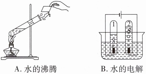 5. 下图所示的两个实验中,发生物理变化的是实验______;实验 B 中没有发生改变的粒子是______,试管 1 中得到的气体是______,试管 2 中收集的气体可用______来检验。