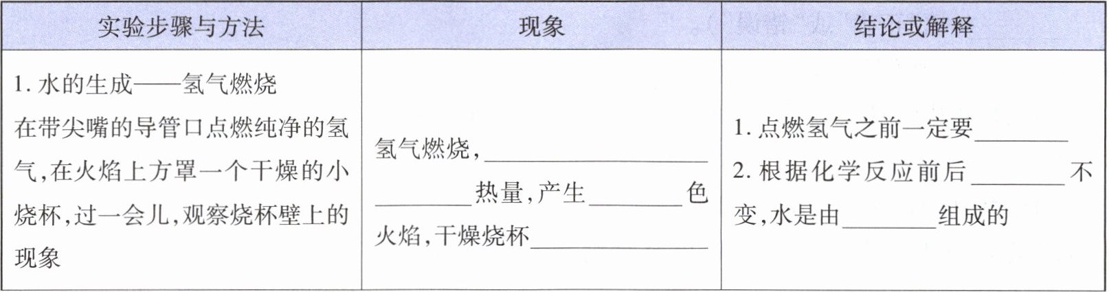 |1. 水的生成——氢气燃烧在带尖嘴的导管口点燃纯净的氢气,在火焰上方罩一个干燥的小烧杯,过一会儿,观察烧杯壁上的现象|氢气燃烧,______热量,产生______色火焰,干燥烧杯______|1. 点燃氢气之前一定要______2. 根据化学反应前后______不变,水是由______组成的|