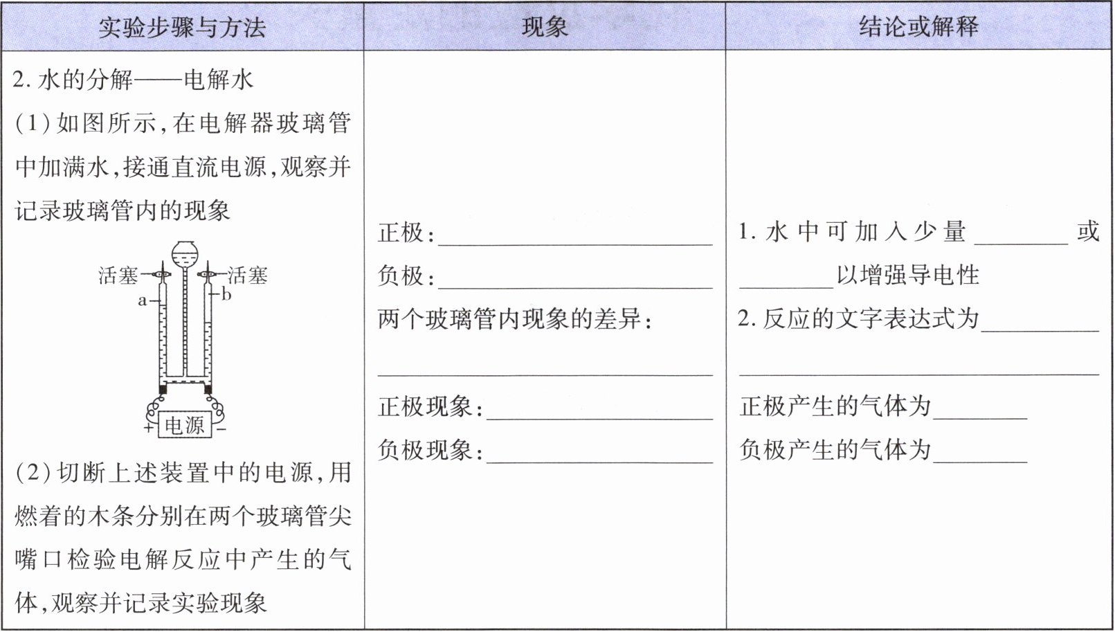 |2. 水的分解——电解水(1) 如图所示,在电解器玻璃管中加满水,接通直流电源,观察并记录玻璃管内的现象(2) 切断上述装置中的电源,用燃着的木条分别在两个玻璃管尖嘴口检验电解反应中产生的气体,观察并记录实验现象|正极:______负极:______两个玻璃管内现象的差异:______正极现象:______负极现象:______|1. 水中可加入少量______或______以增强导电性2. 反应的文字表达式为______正极产生的气体为______负极产生的气体为______|