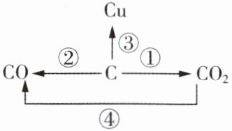 ①${C + O_{2}\xlongequal{点燃}CO_{2}}$ ②${2C + O_{2}\xlongequal{点燃}2CO}$ ③${C + 2CuO\xlongequal{高温}2Cu + CO_{2}\uparrow}$ ④${CO_{2} + C\xlongequal{点燃}2CO}$