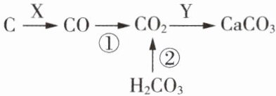 B 【解析】若X为氧气(单质)或二氧化碳(氧化物)与碳反应可以生成一氧化碳,故A正确;反应①中一氧化碳与氧化铜(或其他金属氧化物)反应,不属于置换反应,因为置换反应是一种单质与一种化合物反应,生成另一种单质与另一种化合物的反应,故B不正确;Y为${Ca(OH)2}$,可以检验二氧化碳,故C正确;碳酸不稳定易分解生成二氧化碳(${H2CO3\xlongequal{}H2O + CO2\uparrow}$),故D正确。