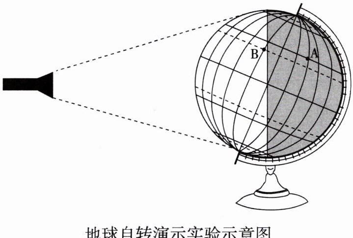 6. 小明同学做了用手电筒(表示太阳)和地球仪(表示地球)演示地球自转运动的实验,拨动地球仪模拟地球自转运动,观察地球仪上的受光区域及其变化。下图为地球自转演示实验示意图。读图,回答下列问题。