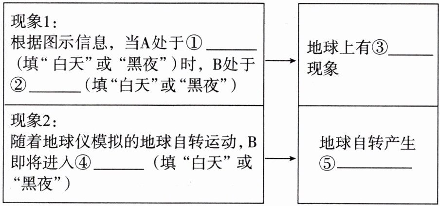 (2)现象1:根据图示信息,当A处于①黑夜(填“白天”或“黑夜”)时,B处于②白天(填“白天”或“黑夜”)|地球上有③昼夜现象|现象2:随着地球仪模拟的地球自转运动,B即将进入④黑夜(填“白天”或“黑夜”)|地球自转产生⑤昼夜交替|