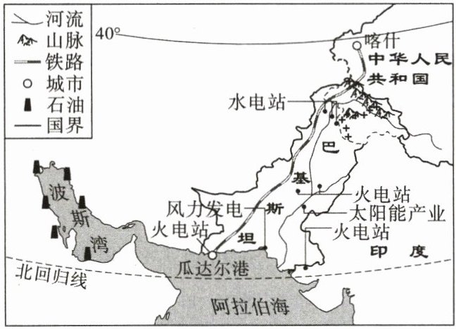 材料二 迄今为止,该项目建设和实施已为巴基斯坦创造了超过 75 000 个直接就业机会,截至 2018 年底,已有 7 座能源项目建成投产,为其国家电网增加了 3 240 兆瓦电力,占全国总装机容量的 11%以上。右上图为我国企业在巴基斯坦重大投资项目分布示意图。