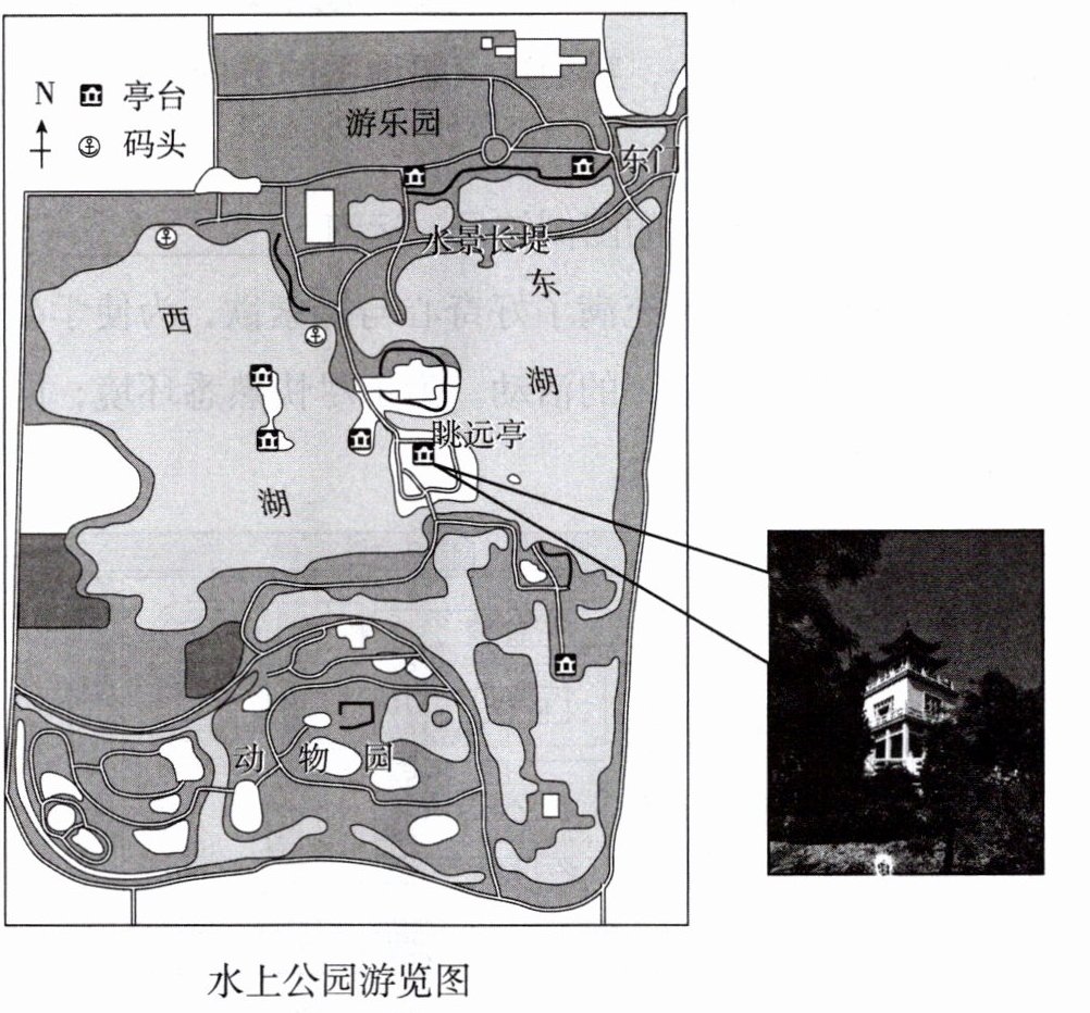 (1) 在水上公园游览图中量算东门至眺远亭之间的距离,图中缺少的要素是