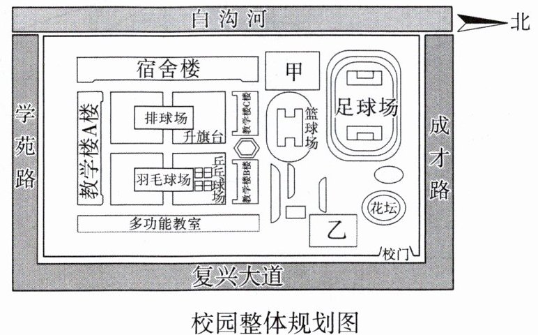 13. 新学期,同学们对新校园充满了好奇心与探索欲,为使学生熟悉校园环境,学校开展了“走进新校园 体验新环境”的活动。为了尽快熟悉环境,同学们绘制了一幅校园整体规划图。读图,回答下列问题。