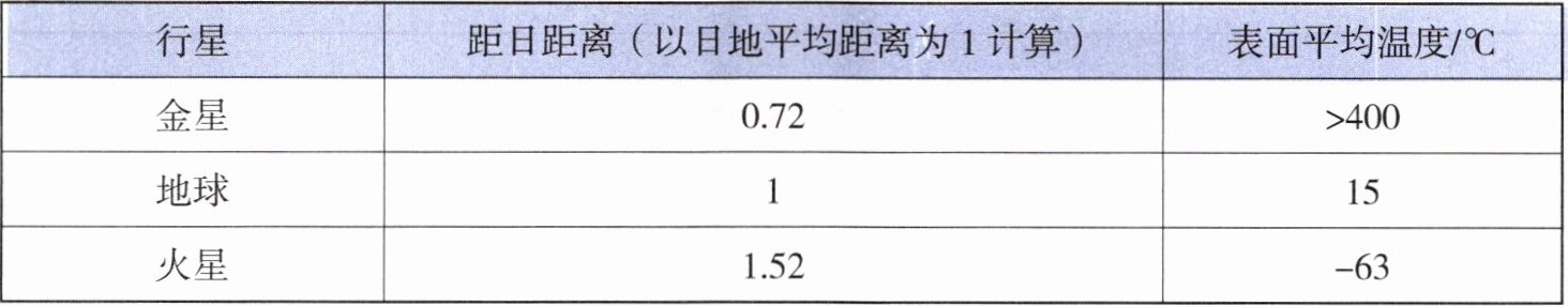 3. 比较地球与金星、火星的表面平均温度,地球容易形成适合人类生存的温度条件,其原因可能是(