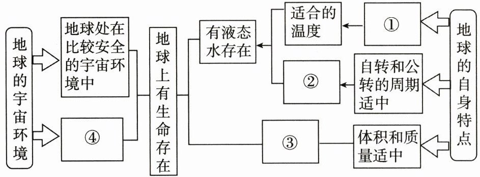 。(2分)(3)与其他行星相比,地球是一颗特殊的行星,其特殊性表现在它是一颗存在生命的行星。请按照相互关系,将下列字母填在对应的横线上。(8分)