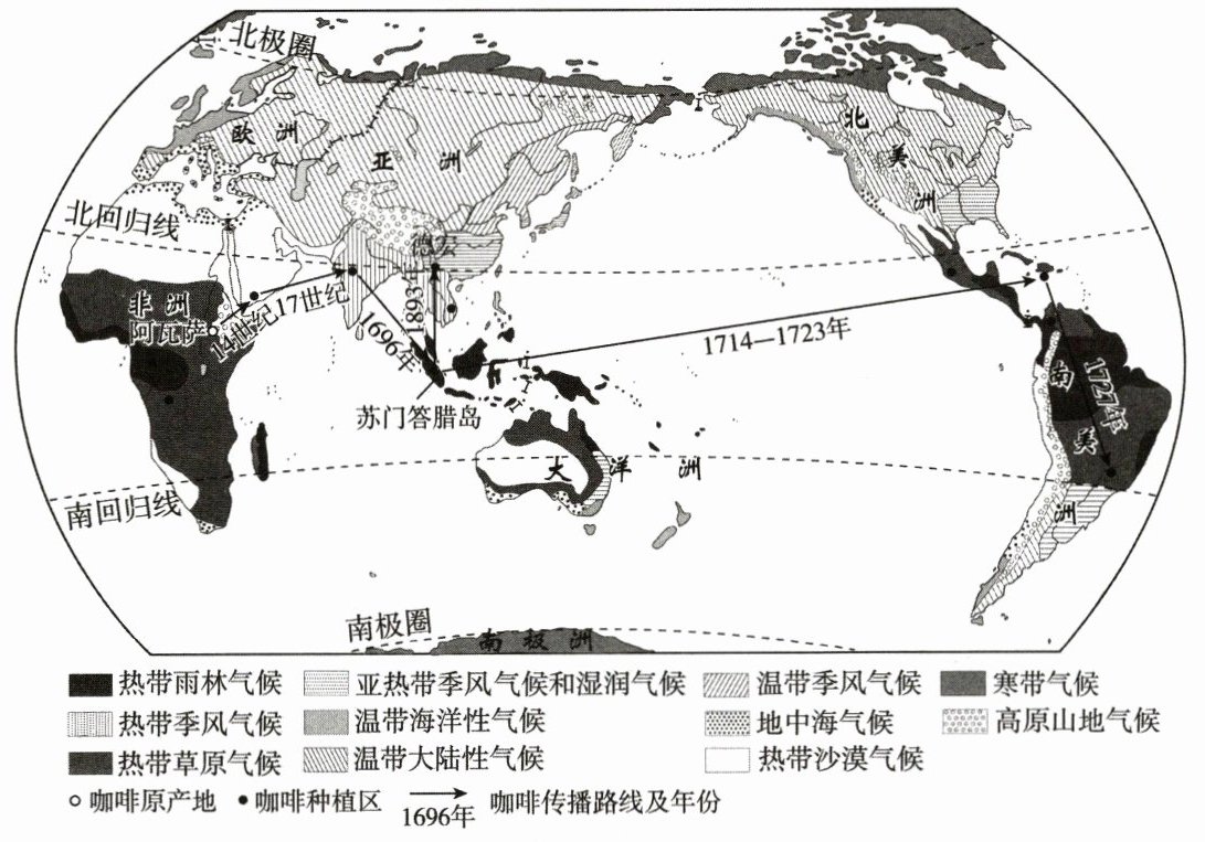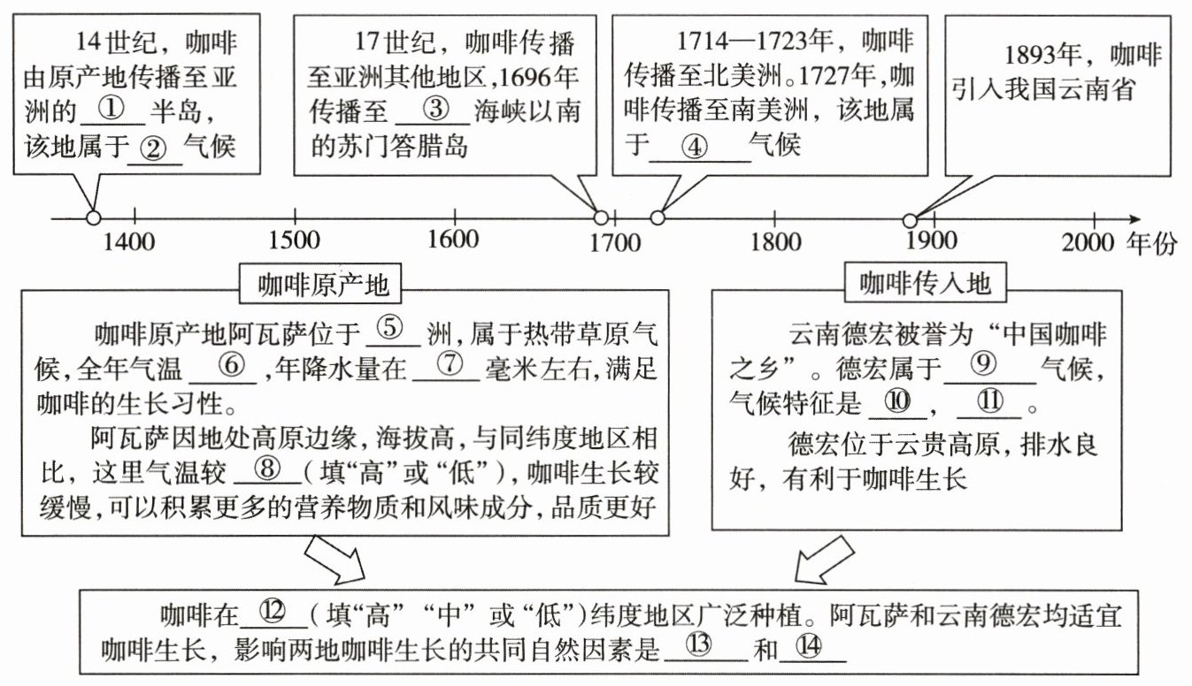 (2)了解咖啡传播历史,比较咖啡种植区域的自然环境特征。读下面框图,写出下列序号代表的正确含义。(7 分)