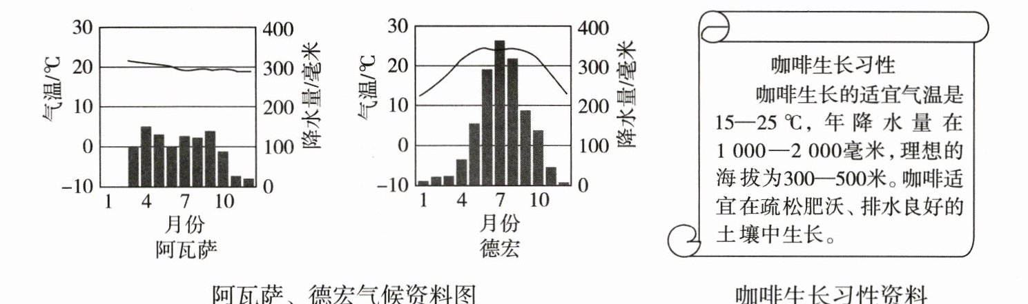 (1)同学们对咖啡原产地阿瓦萨的气候特征进行了研究,请根据他们整理好的气温和降水量数据,将上图中阿瓦萨的气温曲线和降水量柱状图补充完整。(3 分)