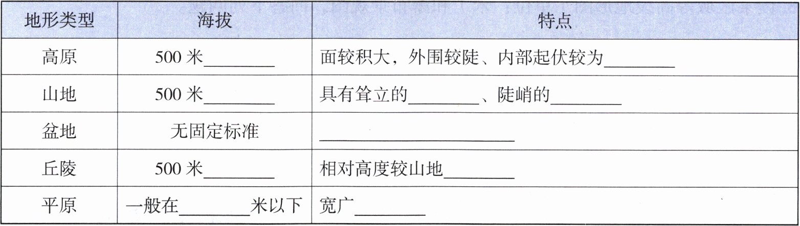 。3. 陆地表面的地形类型有山地、丘陵、高原、平原和盆地五种。根据所学知识,填表。
