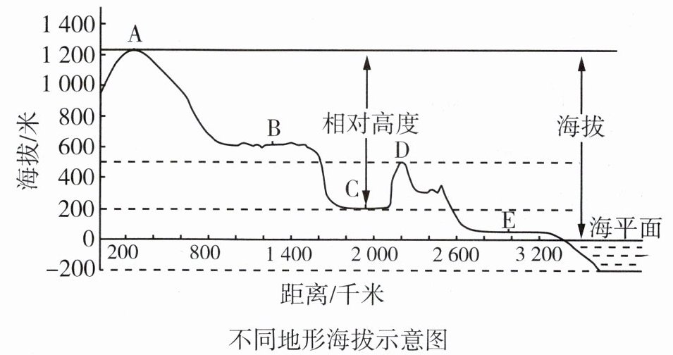 2. 读不同地形海拔示意图,判断 A、B、C、D、E 各点所在地形分别属于哪一种地形类型。