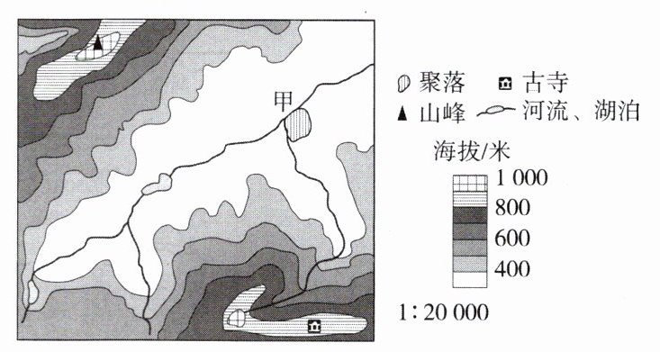 (1)300—400【解析】在分层设色地形图中,不同颜色代表不同海拔,对照图例可知,甲聚落海拔范围为300—400米。