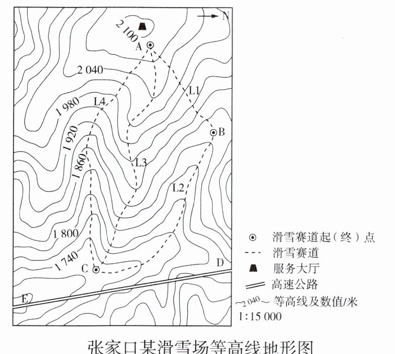 (4)B【解析】根据图中等高线疏密程度判断坡度陡缓,可知L4赛道坡度情况为先缓后陡再缓,A错误;等高线的弯曲部分向海拔高处凸出的为山谷,根据图中等高线分布情况可知,L2赛道位于山谷,B正确;该图等高距为30米,C点的海拔介于1710—1740米,C错误;依据指向标判断方向,服务大厅位于滑雪场赛道的西方,D错误。故选B。