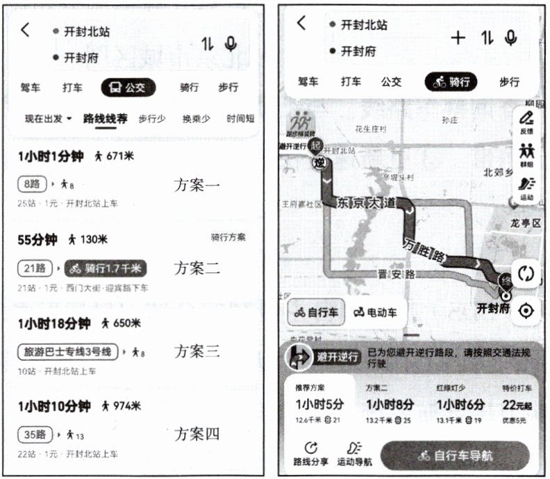 材料 每年的10月18日至11月18日是河南开封一年一度的菊花文化节,2023年中国开封第41届菊花文化节如期举行。家住北京的贝贝准备利用周末时间坐高铁到开封北站,然后搭乘交通工具到开封府参观旅游。下面为由开封北站到开封府的出行方式及路线导航图。