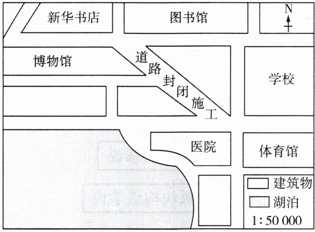 材料 地图作为一种“地理语言”,可以传达其他数字、图表无法表达的信息。江西省南昌市某学校地理研学小组的同学们计划从学校步行前往附近的新华书店为班级购买地图。为方便出行,他们决定用所学地图知识绘制简易地图(下图),并设计了如下步骤,请帮助他们完善相关步骤。