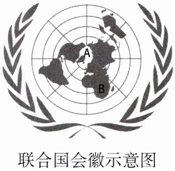 联合国徽章图案是以北极点为中心的世界地图,由交叉的橄榄枝组成的花环相托而成。地图包括五个同心圆,投影范围延伸至 60°S。读联合国徽章示意图,回答 3、4 题。