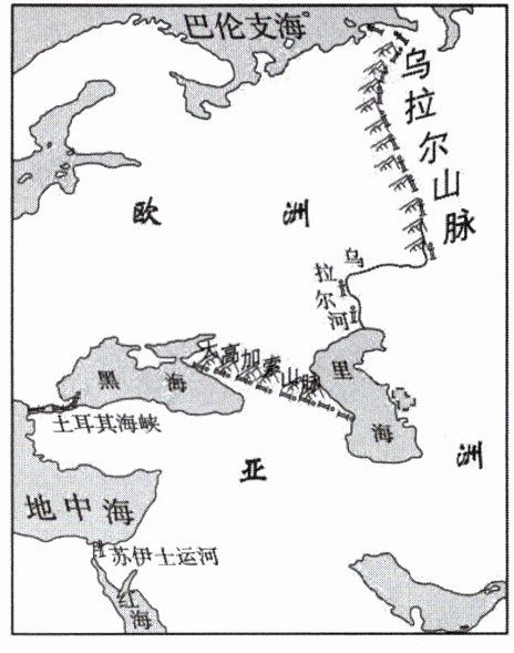 (3)亚洲与欧洲的分界线借助了天然界线,如山脉、河流、湖泊和海峡。读亚洲与欧洲、非洲的分界示意图可知,亚洲与欧洲的分界线为: