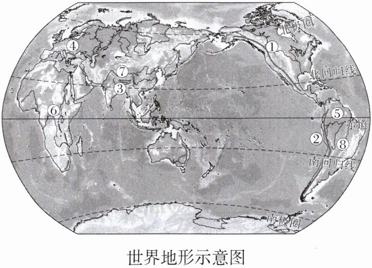 ①落基 ②安第斯 ③喜马拉雅 ④阿尔卑斯 ⑤亚马孙 ⑥刚果 ⑦青藏 ⑧巴西