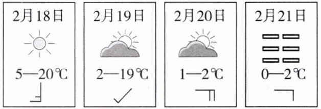 C【解析】读图可知,这四天中2月21日有雾,雾会对司机视线造成影响,因此汽车驾驶员需要注意交通安全,A正确,不符合题意;风力最强的是20日,东风4级,B正确,不符合题意;气温最低的是2月21日,此时吹东风,C错误,符合题意;一天中气温相差最大的是2月19日,气温相差17℃,D正确,不符合题意。故选C。
