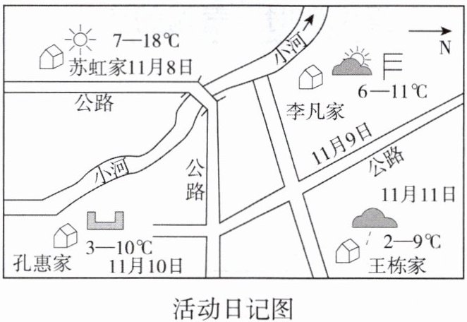 11. 小海是个地理迷,他所在班级成立了“学习促进组”,组织了一次“送学到家”的活动。下图是他绘制的活动日记图。读图,回答下列问题。