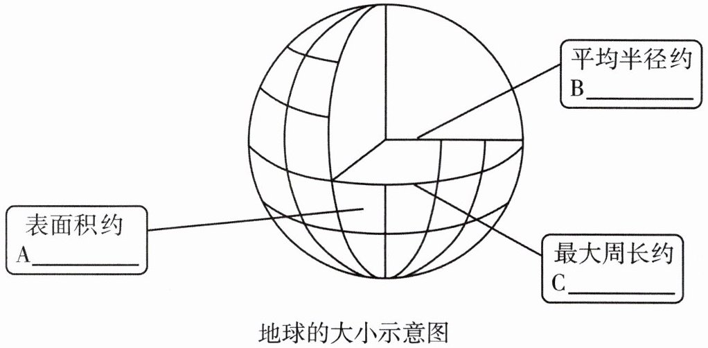 2. 请在地球的大小示意图中填写有关地球大小的数据。