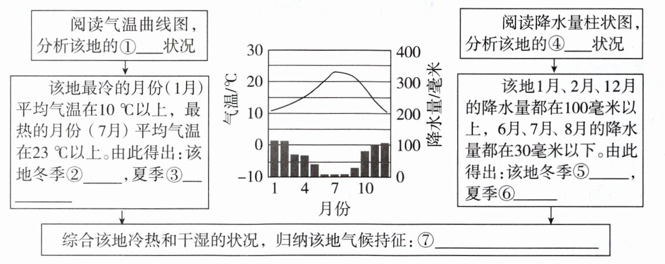 ①冷热 ②温和 ③炎热 ④干湿 ⑤多雨⑥少雨 ⑦冬季温和多雨,夏季炎热干燥
