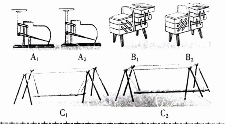【解析】:平行四边形连杆的关键特性是移动时两对边始终保持平行。对于(A)指针式弹簧秤,连杆需带动指针稳定指示,A₂中连杆结构对称且平行关系稳定,A₁可能存在单边受力导致平行性破坏;(B)活动工具箱,平行四边形连杆应保证箱体平稳移动,B₂的连杆交叉设计会使运动轨迹不稳定,B₁的平行连杆结构合理;(C)儿童荡板,两侧支架与荡板构成平行四边形才能保证荡板水平往复运动,C₁两侧支架不对称,平行关系易失衡,C₂结构对称平行性稳定。综合判断,问题在于各选项中破坏平行四边形稳定平行特性的设计。