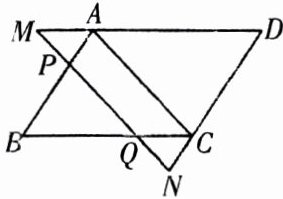 $ \therefore AM // CQ $。又 $ \because AC // MN $,即 $ AC // MQ $,$ \therefore $ 四边形 $ MQCA $ 是平行四边形,$ \therefore MQ = AC $。同理可证 $ PN = AC $,
