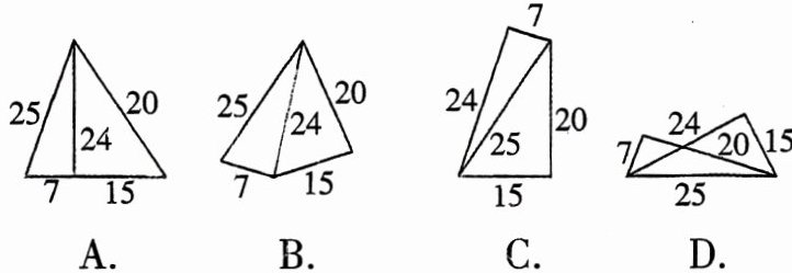 5. 五根小木棒,其长度(单位:cm)分别为7,15,20,24,25.现将它们摆成两个直角三角形,其中正确的是(