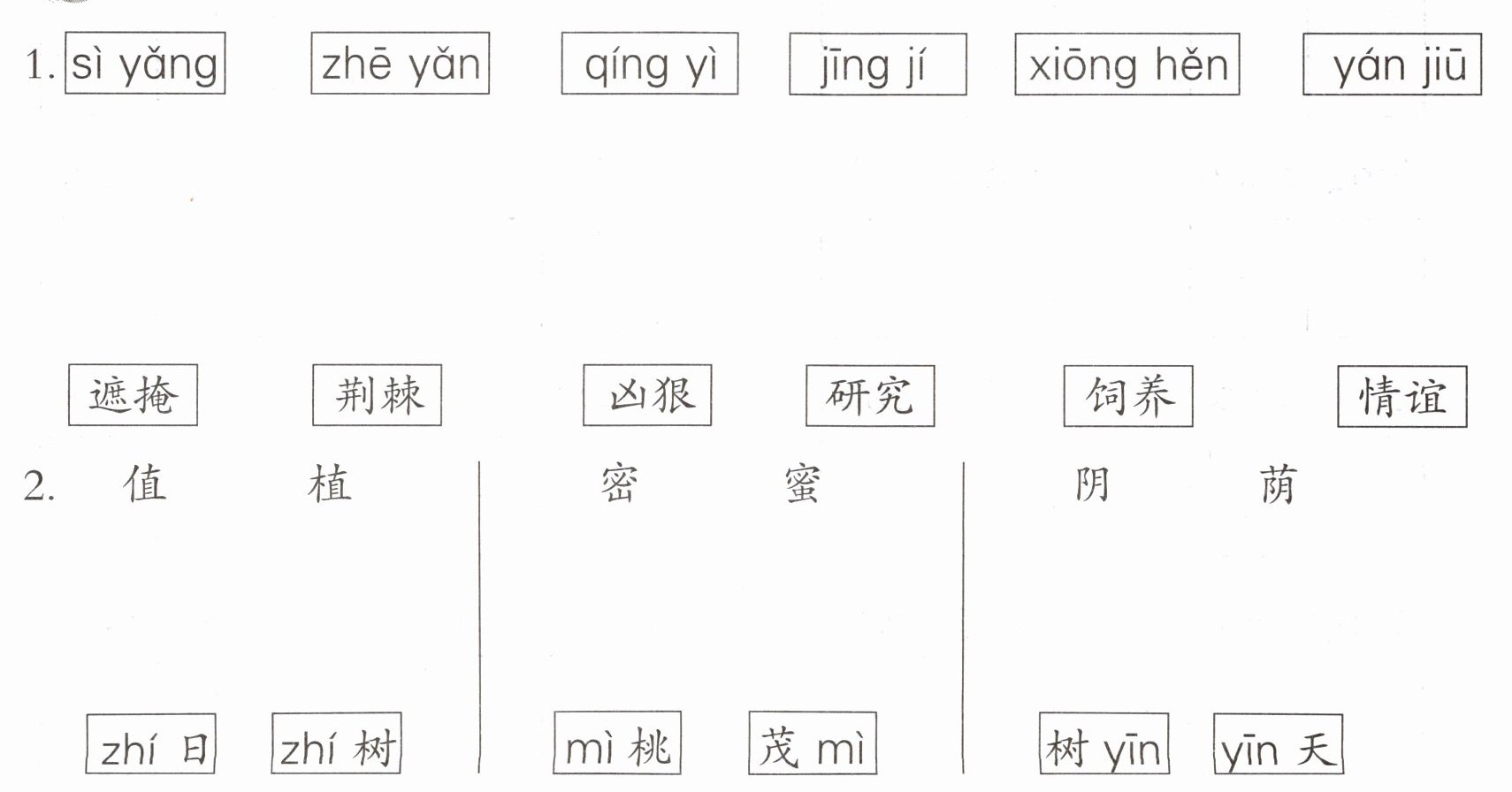 1. sì yǎng——饲养 zhē yǎn——遮掩 qíng yì——情谊 jīng jí——荆棘 xiōng hěn——凶狠 yán jiū——研究