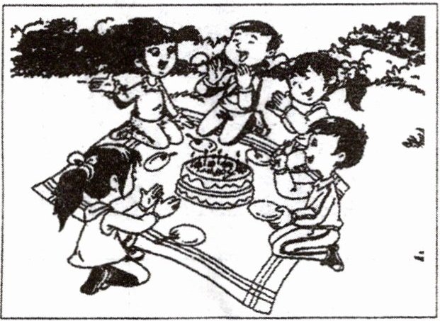 【解析】:画面中,几个小朋友围坐在铺着格子餐布的草地上,中间放着一个插着蜡烛的蛋糕,他们有的拍手,有的露出开心的笑容,看起来正在庆祝生日。可以从环境、人物的动作和表情入手,想象他们可能在唱歌、许愿等场景,用通顺的语句描述出来。