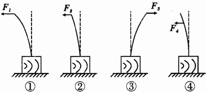 16. 如图所示,使一薄锯条一端固定,现分别使用不同的力使其发生如图①、②、③、④中所示的形变,如果$F_{1}= F_{3}= F_{4}>F_{2}$,通过下列四幅图所示的情景具体归纳出力的作用效果与哪些因素有关?