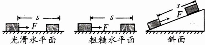 4. 如图所示,物体在相同的力F的作用下沿力的方向移动s的距离,试比较三种情况力对物体做功的多少:$W_{1}$