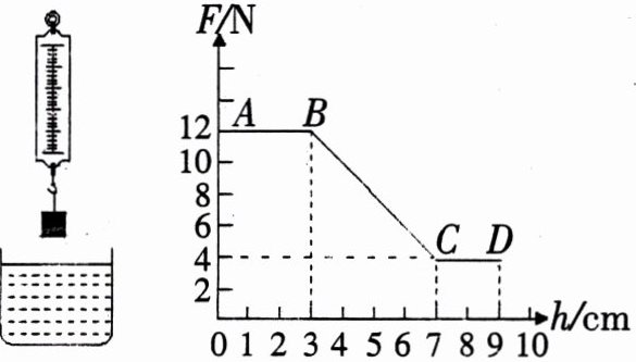 20. (12分)在弹簧测力计下挂一个圆柱体,从盛水的烧杯上方某一高度缓慢下降,圆柱体浸没后继续下降,直到圆柱体底面与杯底部接触为止。如图所示,是圆柱体下降过程中弹簧测力计读数F随圆柱体下降高度h变化的图象。求: