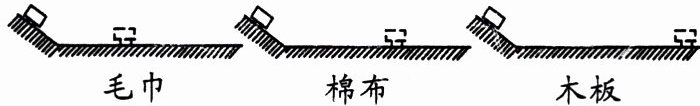 12. 如图所示是小强同学探究物体不受力时运动规律的实验装置。他共做了三次实验,第一次让小车从斜面上运动到水平的毛巾表面上。第二次让小车从斜面上同一高度运动到水平的棉布表面上。第三次让小车从斜面上同一高度运动到水平的木板表面上。小车停下来的位置如图所示。如果让小车从斜面的同一高度运动到水平玻璃表面上,小车运动的距离将会